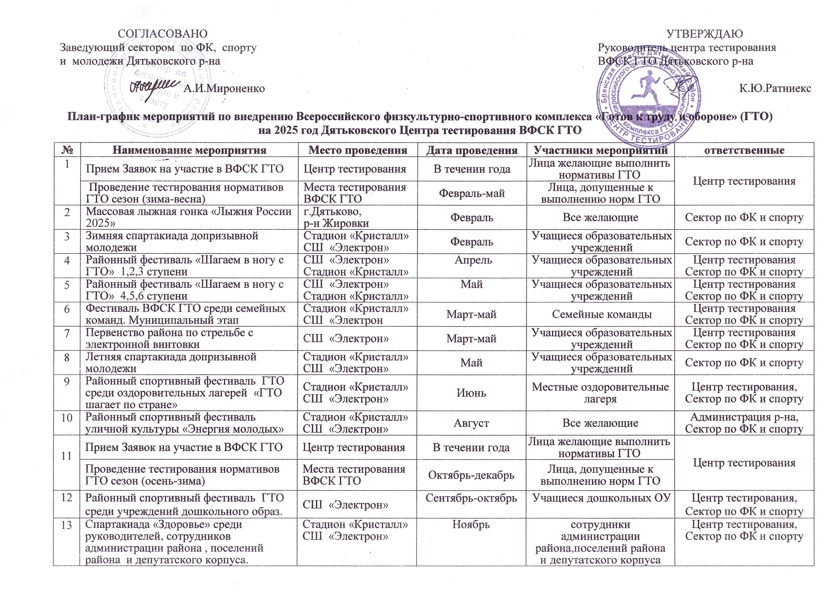 Согласно графика, установленного Центром тестирования Дятьковского района (смотри ниже план-график) происходит прием нормативов ВФСК ГТО.